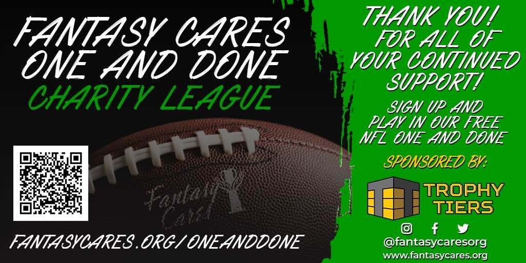 Register for our FREE Fantasy Cares One and Done league sponsored by Trophy Tiers. After registering you will get an invite to the league hosted on MYFANTASYLEAGUE. Each week pick a QB, RB, WR, TE and K and accumulate points, and just like the survivor, you can only pick those players once! Join to try and win your way into Scott Fish Bowl 15 (must be eligible) and get a trophy from Trophy Tiers and become the first tier in our trophy for this contest. This campaign will end Sunday morning 10 AM ET.