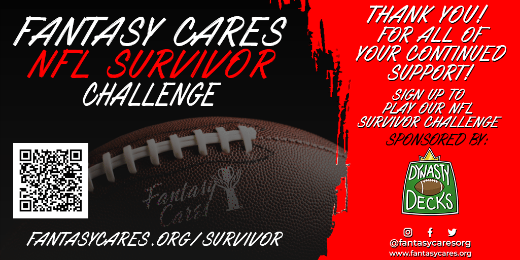 Jump in our NFL SURVIVOR CHALLENGE sponsored by Dynasty Decks. Make a donation and then just pick a winning team each week, but you can only pick a team once to win! The winner will get a plaque from Dynasty Decks AND win their way into Scott Fish Bowl 15 (must be eligible). This campaign closes SUNDAY when the 1 PM ET games kick off. You will receive the league link in your thank you email after you register.