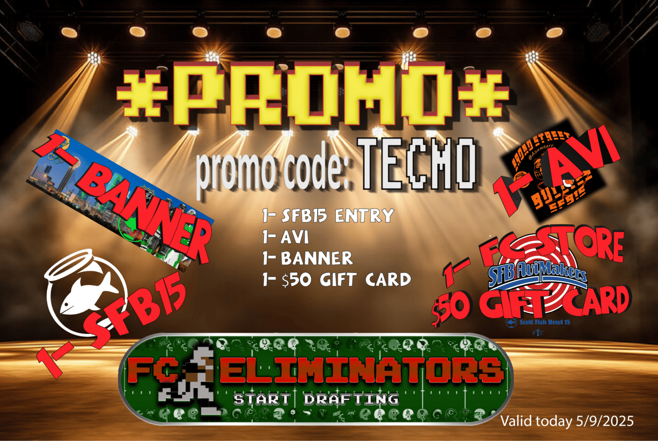 This year we are striving to fill nearly 200 #FCEliminator leagues. Help us to do that by using today’s promo code for a chance to win SFB15 ****SPOT*** AND SFB AVI AND SFB BANNER AND $50 FC SHOP GIFT CARD. Use code TECMO to join FCE leagues between now until they close out (about 50 spots left) and you will be entered into a drawing to win the entire package.*
