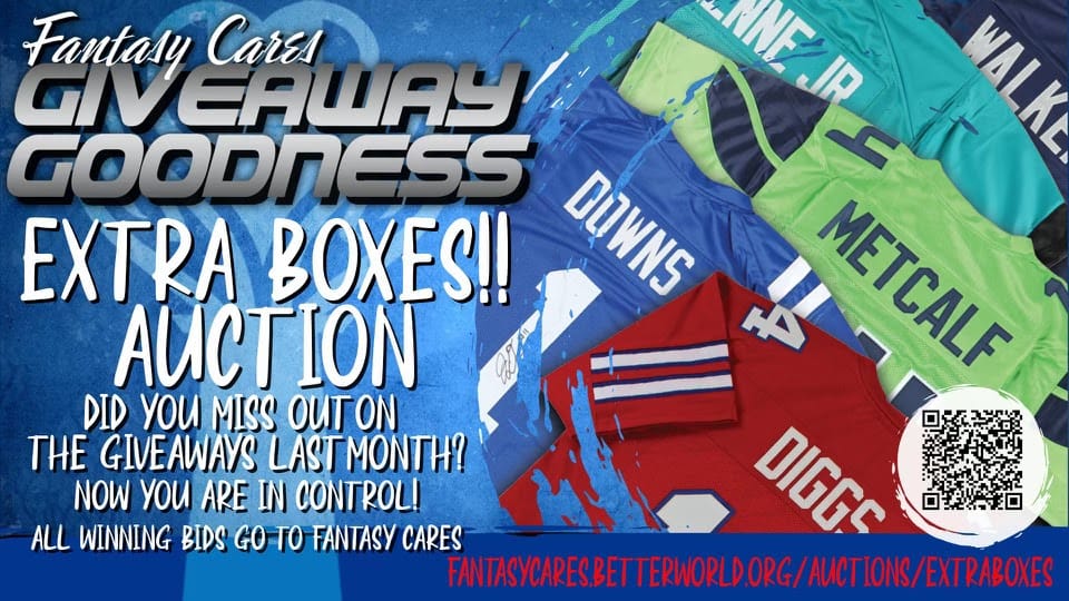 Did you miss out on winning a jersey in our advent calendar? Well we had some jerseys left over and we decided to auction them off! Head over to https://fantasycares.betterworld.org/auctions/EXTRABOXES and bid for your chance to win a DK Metcalf, Josh Downs, Kenneth Walker III, Stefon Diggs, or Travis Etienne Jr jersey.